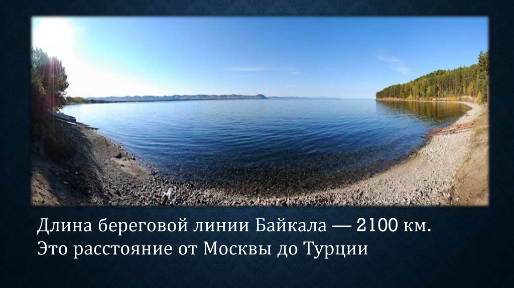 Длина береговой линии Байкала — 2100 км.Это расстояние от Москвы до Турции