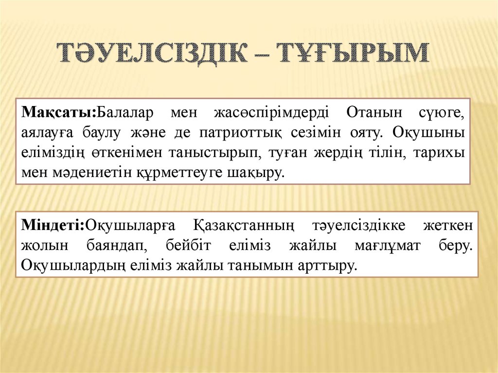 Міндеті:Оқушыларға Қазақстанның тәуелсіздікке жеткен