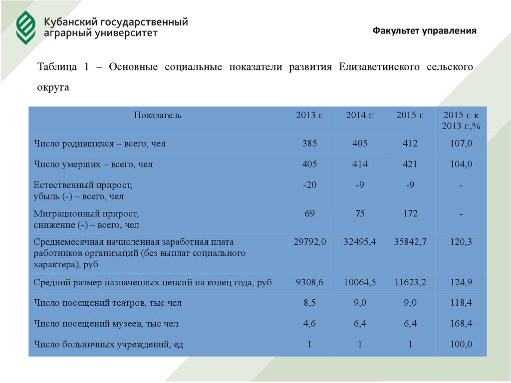 Факультет управленияТаблица 1 – Основные социальные показатели развития Елизаветинского сельского