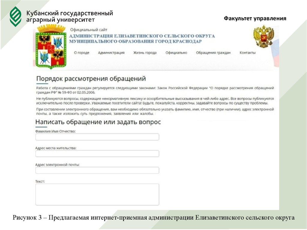 Факультет управленияРисунок 3 – Предлагаемая интернет-приемная администрации Елизаветинского сельского округа