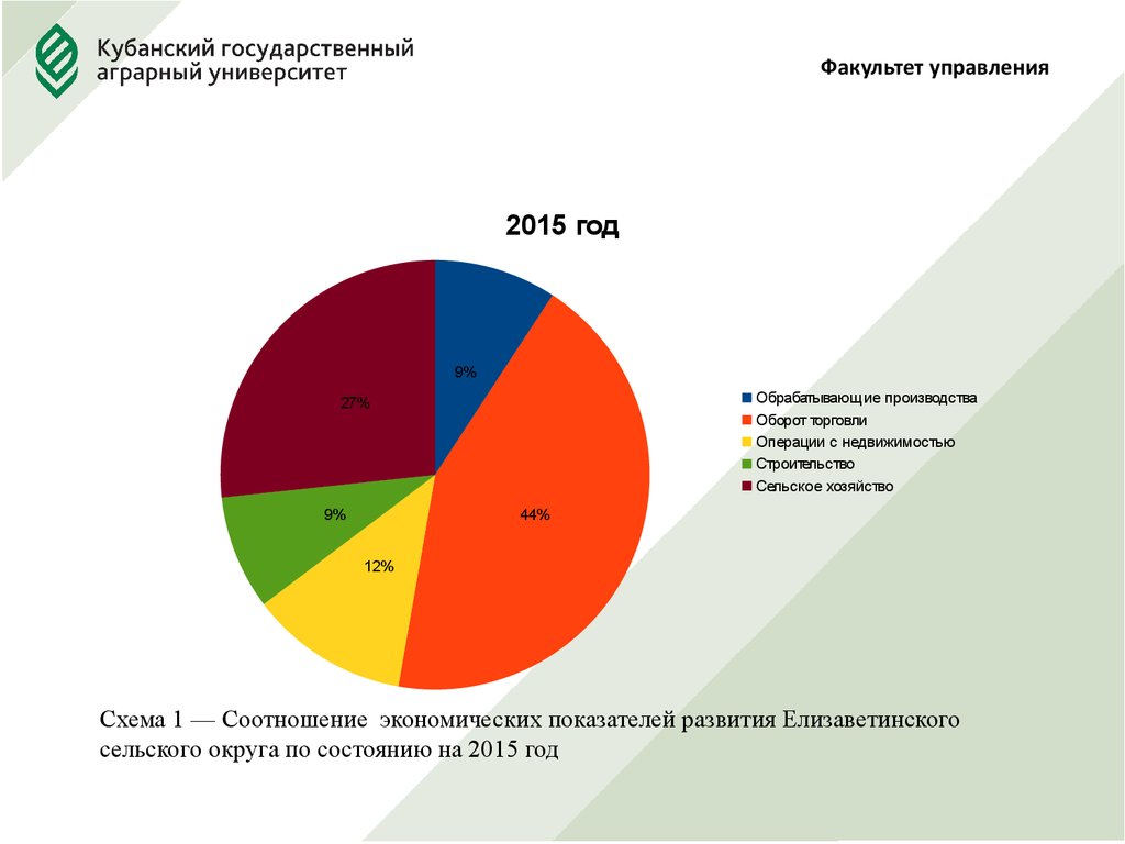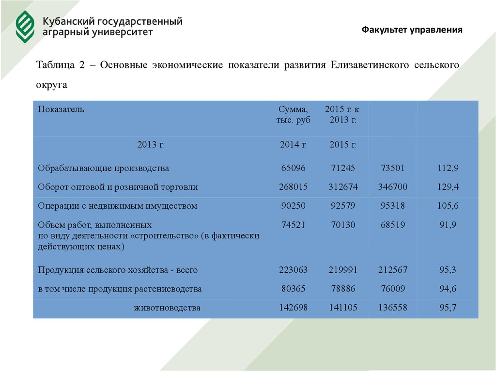 Факультет управленияТаблица 2 – Основные экономические показатели развития Елизаветинского сельского