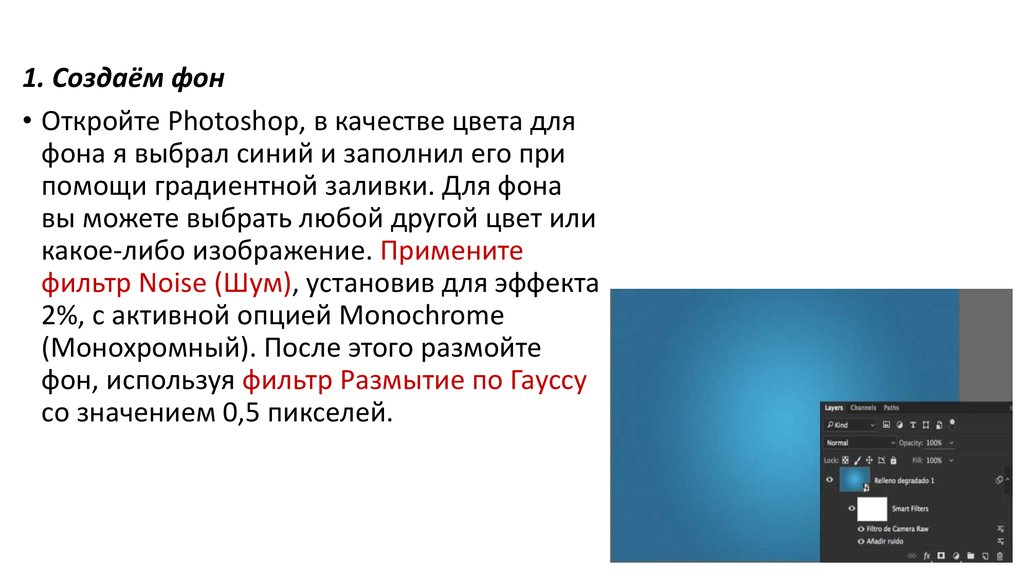 1. Создаём фон• Откройте Photoshop, в качестве цвета для