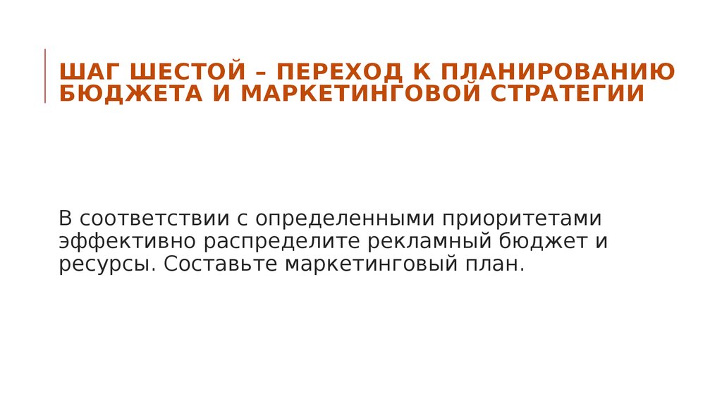 ШАГ ШЕСТОЙ – ПЕРЕХОД К ПЛАНИРОВАНИЮБЮДЖЕТА И МАРКЕТИНГОВОЙ СТРАТЕГИИ