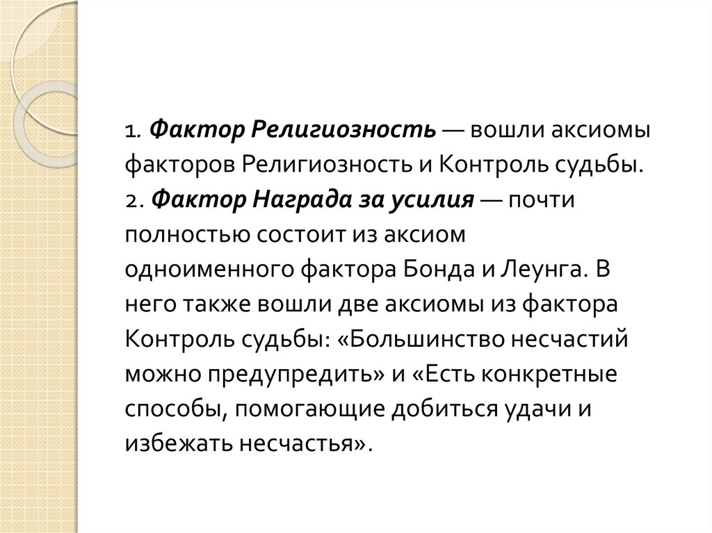 1. Фактор Религиозность — вошли аксиомыфакторов Религиозность и Контроль судьбы.