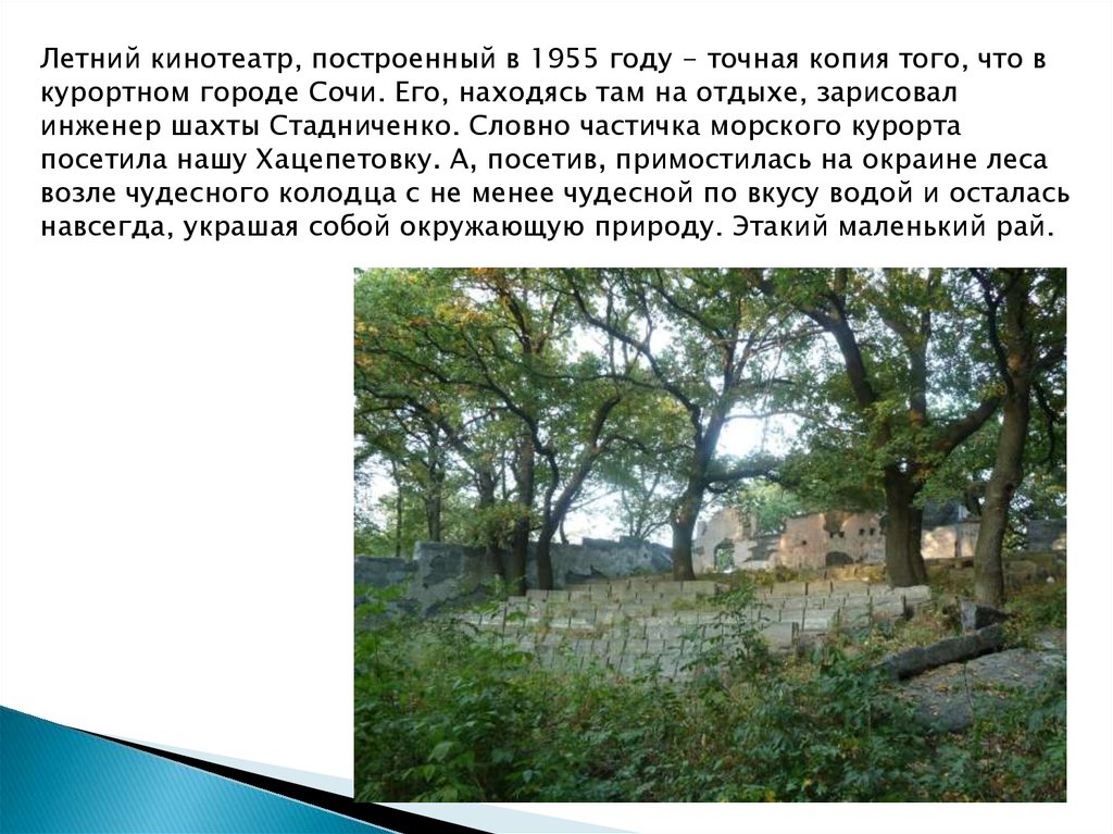 Летний кинотеатр, построенный в 1955 году - точная копия того, что вкурортном городе Сочи. Его, находясь там на отдыхе, зарисовал