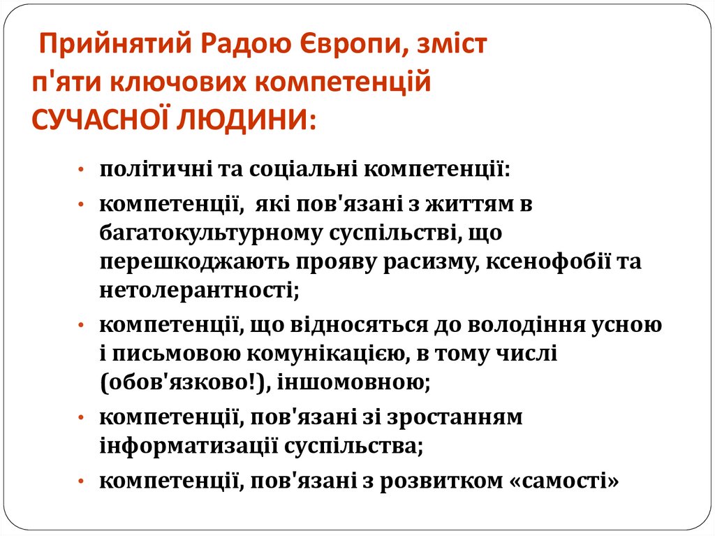 2. Прийнятий Радою Європи, зміст п'яти ключових компетенцій СУЧАСНОЇ ЛЮДИНИ: