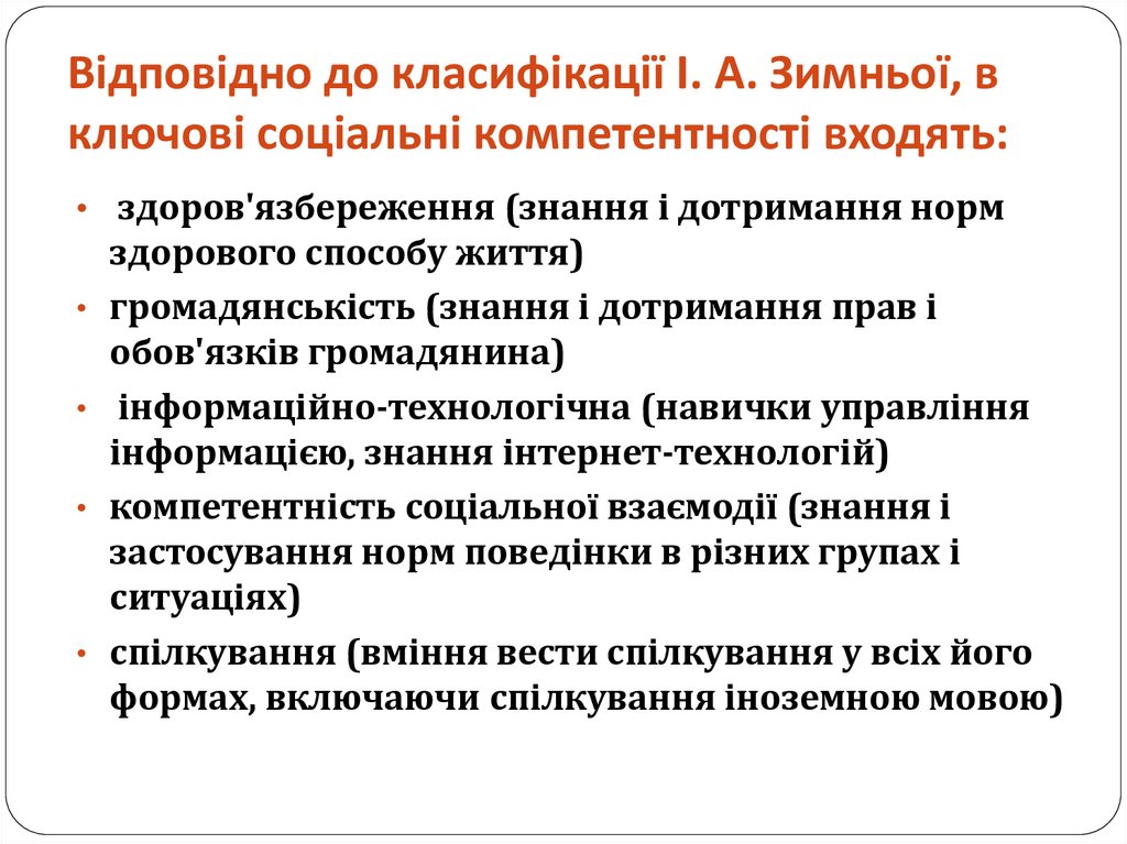 11. Відповідно до класифікації І. А. Зимньої, в ключові соціальні компетентності входять: