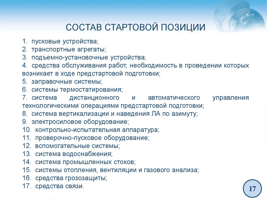 СОСТАВ СТАРТОВОЙ ПОЗИЦИИ1. пусковые устройства;