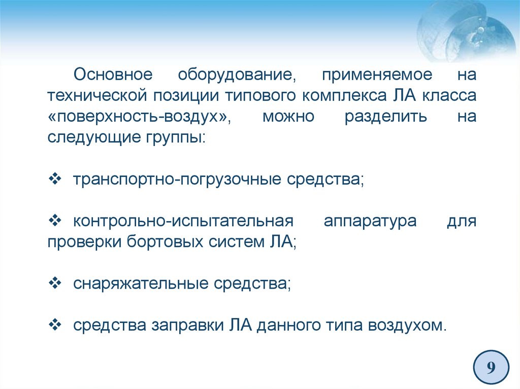 Основное оборудование, применяемое натехнической позиции типового комплекса ЛА класса