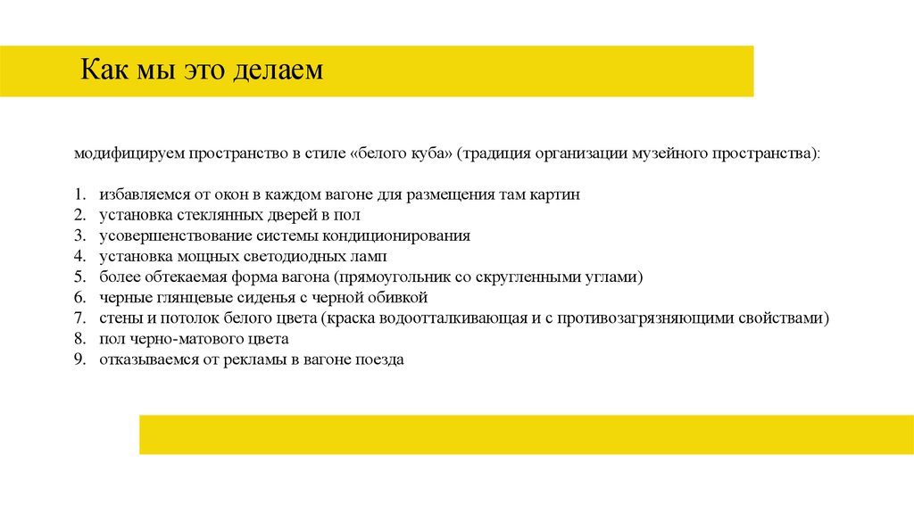 Как мы это делаеммодифицируем пространство в стиле «белого куба» (традиция организации музейного пространства):
