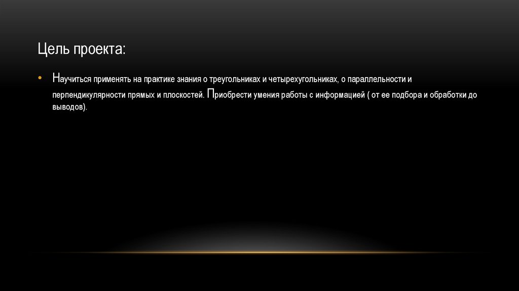 Цель проекта:• Научиться применять на практике знания о треугольниках и четырехугольниках, о параллельности и