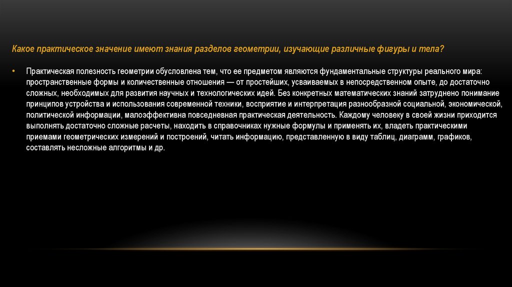 Какое практическое значение имеют знания разделов геометрии, изучающие различные фигуры и тела?Практическая полезность геометрии обусловлена тем, что ее предметом являются фундаментальные структуры реального мира: