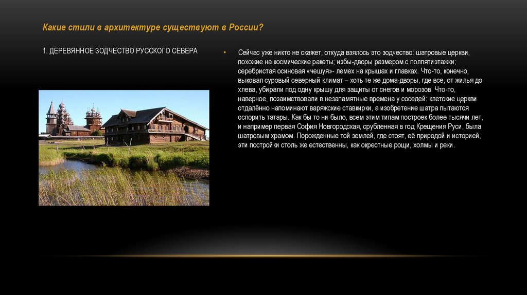 Какие стили в архитектуре существуют в России?1. ДЕРЕВЯННОЕ ЗОДЧЕСТВО РУССКОГО СЕВЕРА