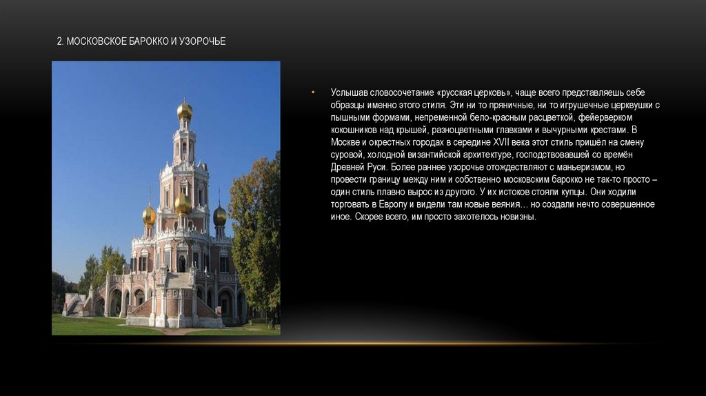 2. МОСКОВСКОЕ БАРОККО И УЗОРОЧЬЕУслышав словосочетание «русская церковь», чаще всего представляешь себе