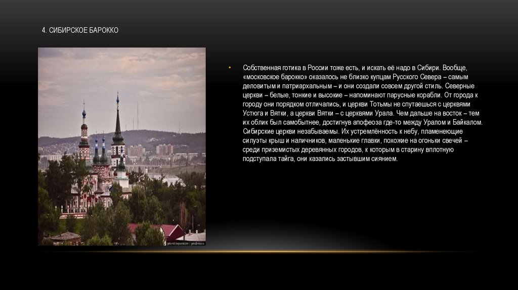 4. СИБИРСКОЕ БАРОККОСобственная готика в России тоже есть, и искать её надо в Сибири. Вообще,