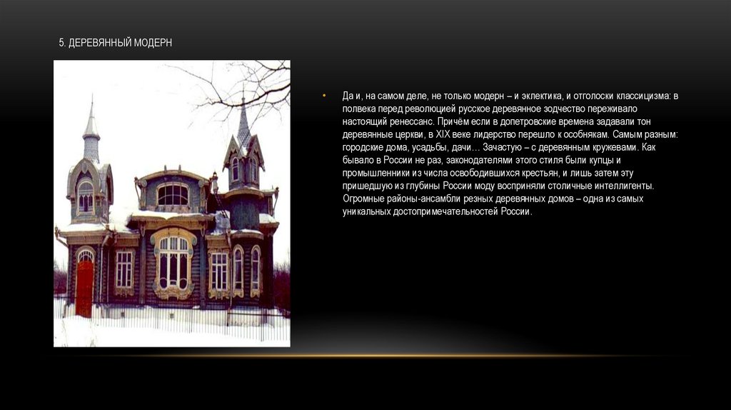 5. ДЕРЕВЯННЫЙ МОДЕРНДа и, на самом деле, не только модерн – и эклектика, и отголоски классицизма: в
