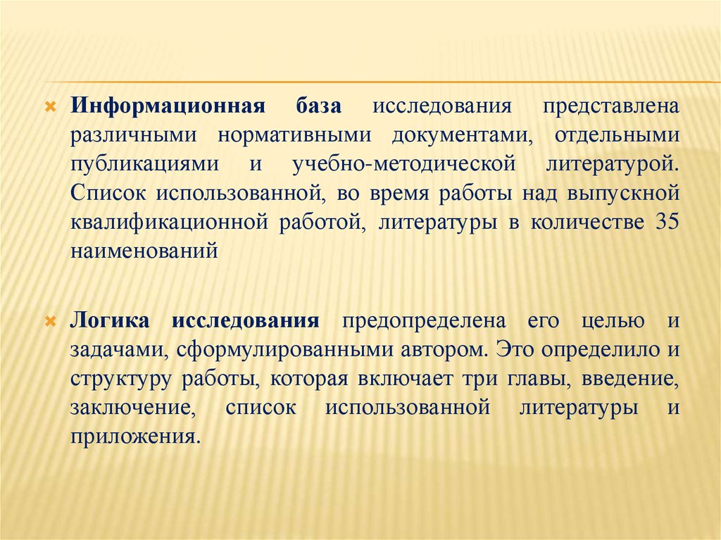 Информационная база исследования представленаразличными нормативными документами, отдельными