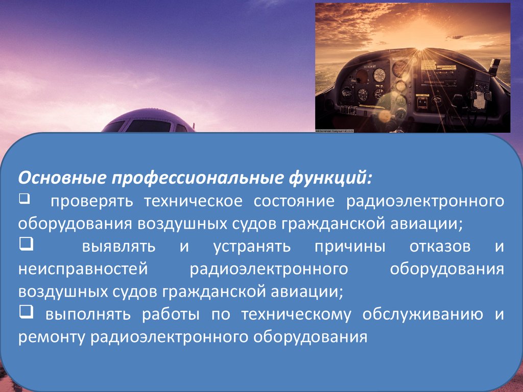Основные профессиональные функций:проверять техническое состояние радиоэлектронного