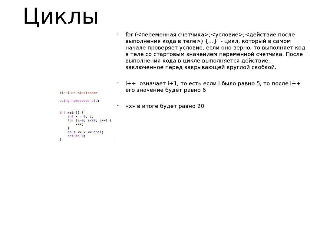 Циклыfor (<переменная счетчика>;<условие>;<действие после