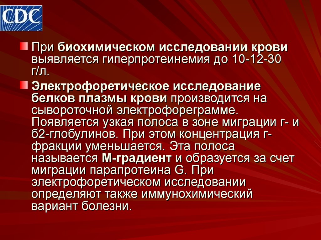 При биохимическом исследовании кровивыявляется гиперпротеинемия до 10-12-30