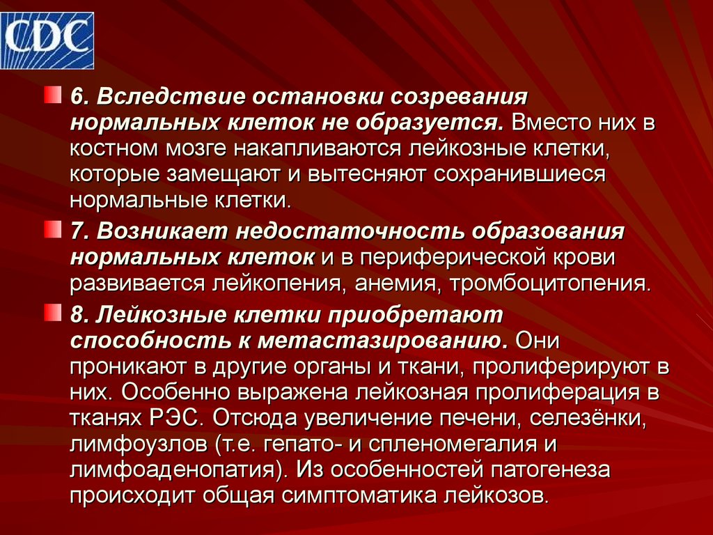 6. Вследствие остановки созреваниянормальных клеток не образуется. Вместо них в