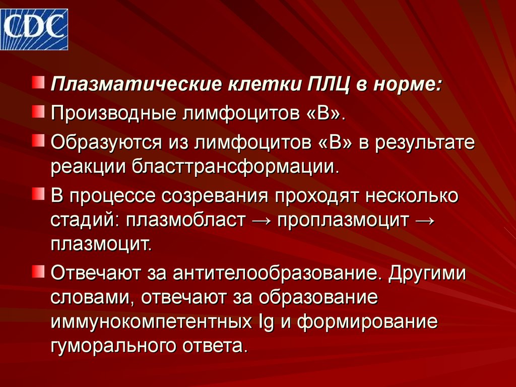 Плазматические клетки ПЛЦ в норме:Производные лимфоцитов «В».