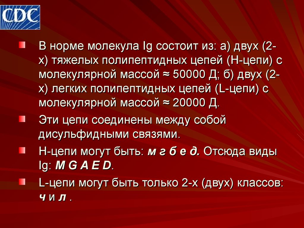 В норме молекула Ig состоит из: а) двух (2х) тяжелых полипептидных цепей (H-цепи) смолекулярной массой ≈ 50000 Д; б) двух (2х) легких полипептидных цепей (L-цепи) с