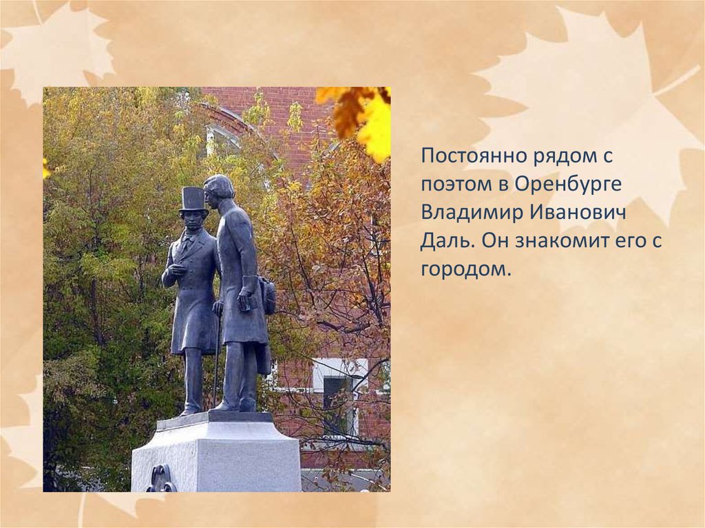 Что показывает В.И.Даль Пушкину? Зауральную рощу, Меновой двор,Георгиевскую церковь, сопровождает в архив.
