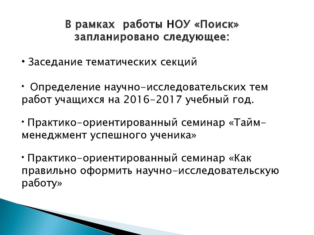 В рамках работы НОУ «Поиск»запланировано следующее: