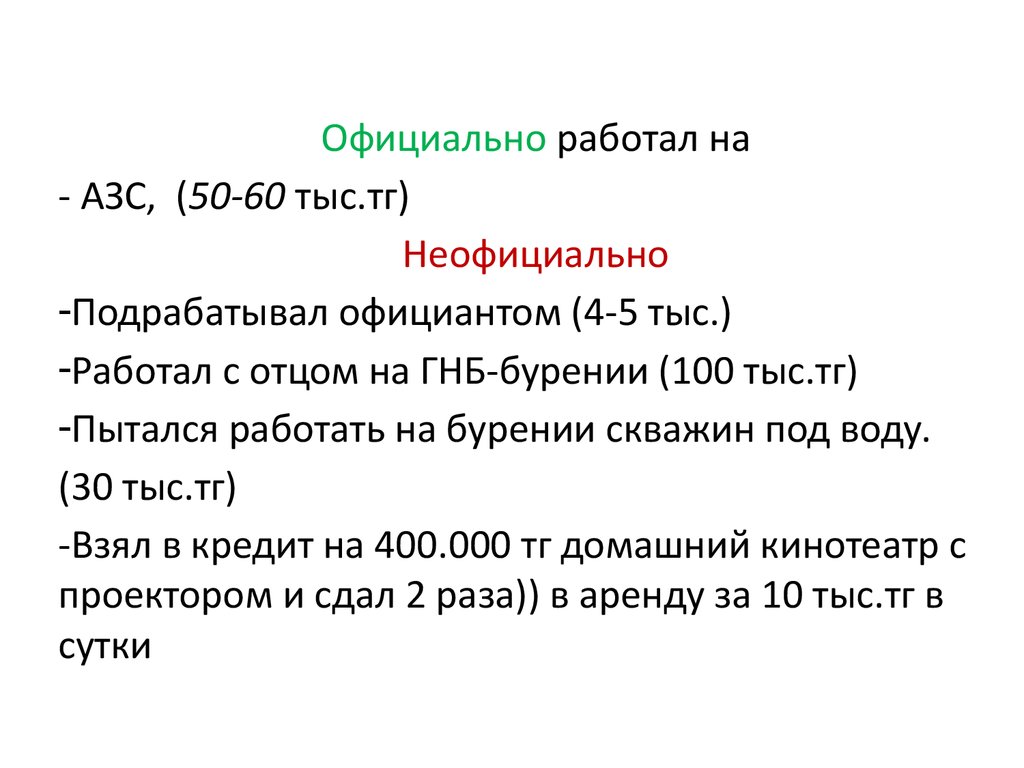 -Работал с отцом на ГНБ-бурении (100 тыс.тг)