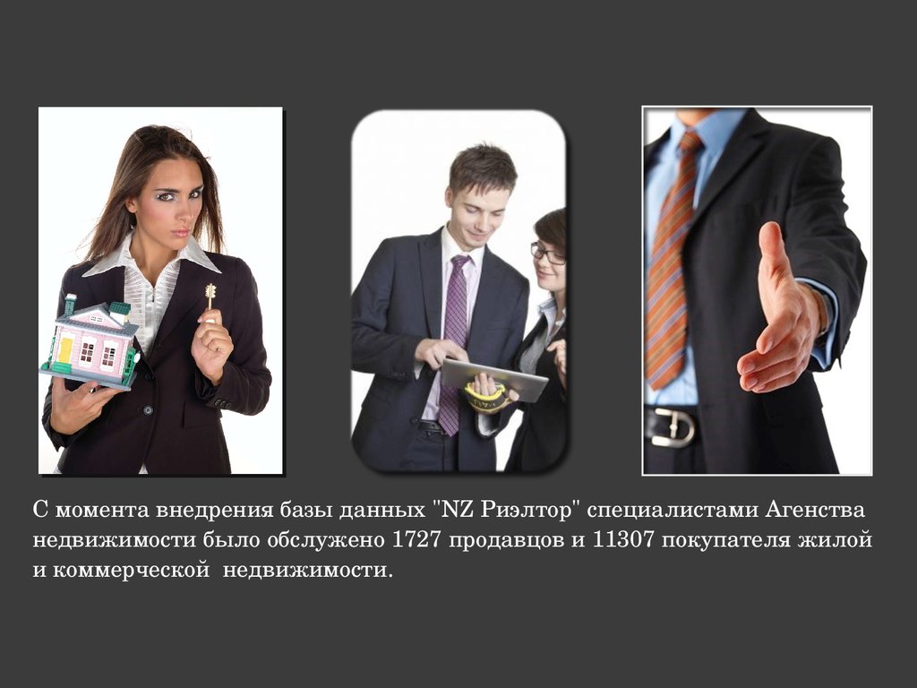 С момента внедрения базы данных "NZ Риэлтор" специалистами Агенстванедвижимости было обслужено 1727 продавцов и 11307 покупателя жилой