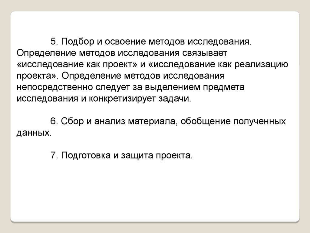 5. Подбор и освоение методов исследования.Определение методов исследования связывает