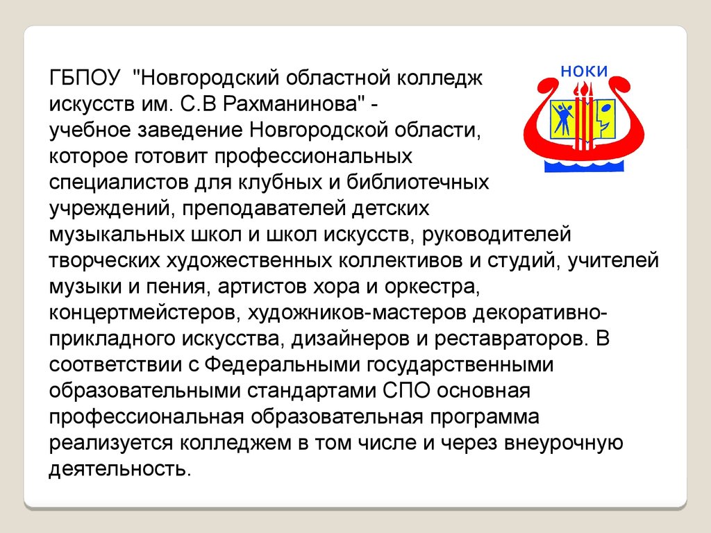 ГБПОУ "Новгородский областной колледжискусств им. С.В Рахманинова" учебное заведение Новгородской области,