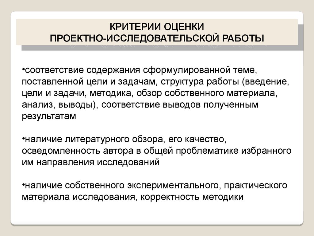 •соответствие результата поставленным целям и задачам•реализуемость проекта (оптимальность планирования,