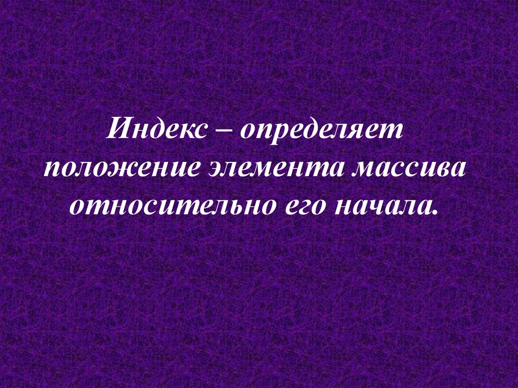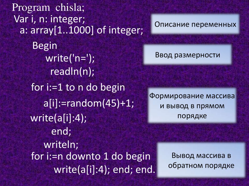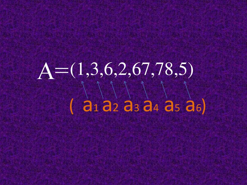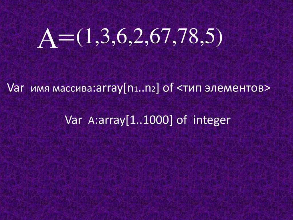 А= (1,3,6,2,67,78,5)Var имя массива:array[n1..n2] of <тип элементов>