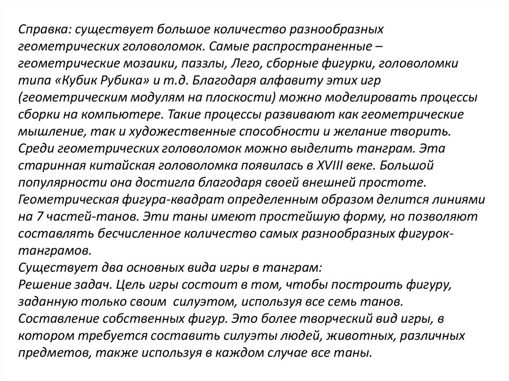 Справка: существует большое количество разнообразныхгеометрических головоломок. Самые распространенные –