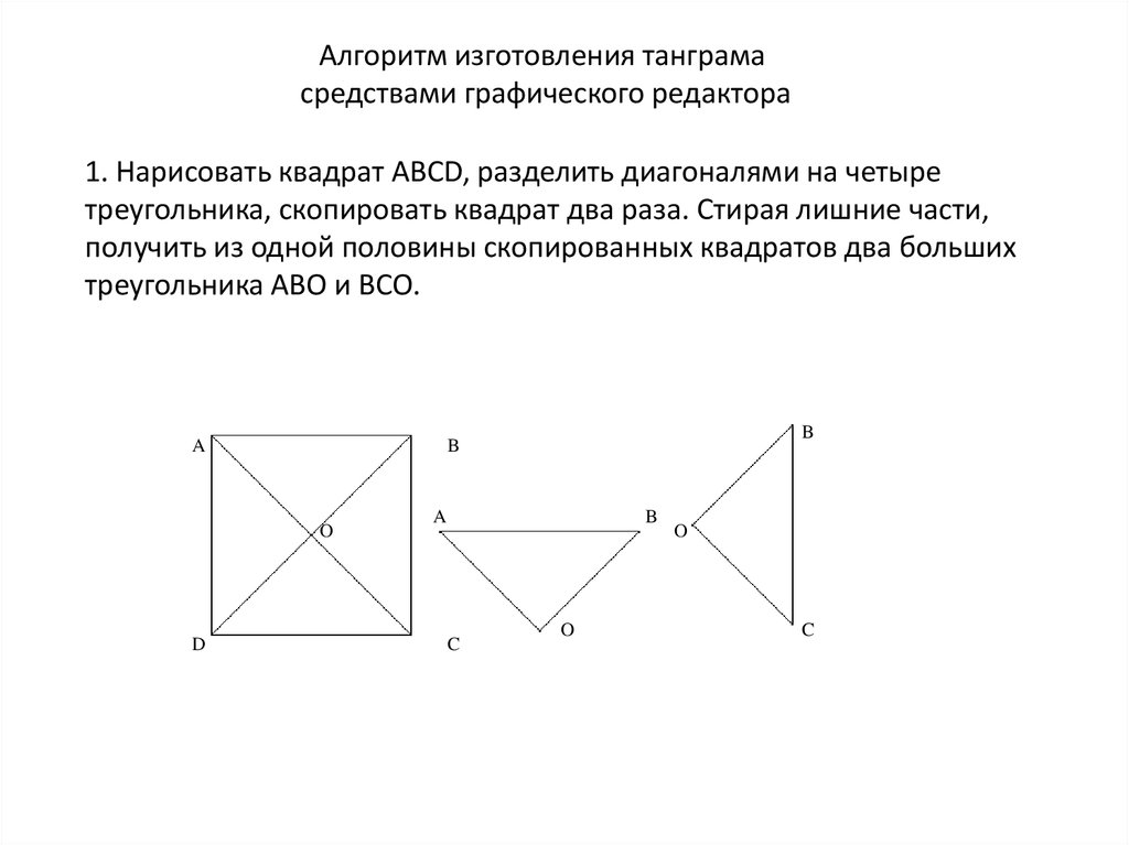 1. Нарисовать квадрат ABCD, разделить диагоналями на четыре