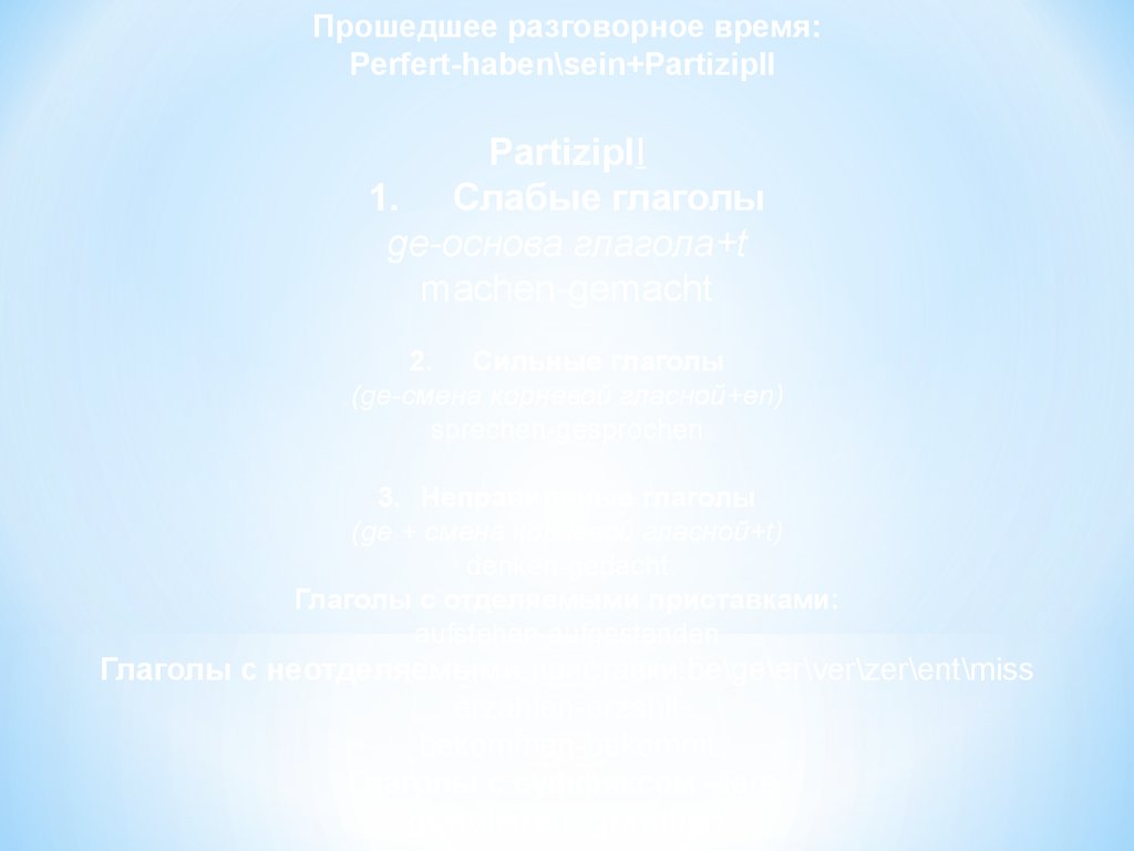 Прошедшее разговорное время:Perfert-haben\sein+PartizipII