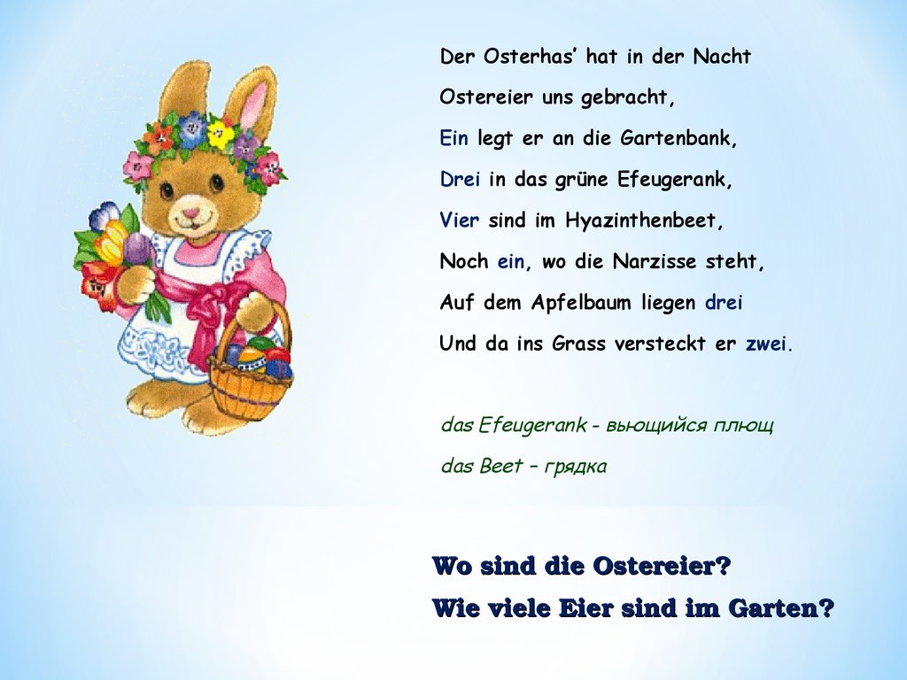 * Die Kinder glauben, der Osterhase versteckt die Ostereier.* Die Deutschen backen «Kulitsch» zu Ostern.