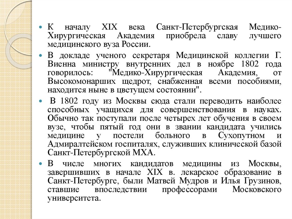 К началу XIX века Санкт-Петербургская МедикоХирургическая Академия приобрела славу лучшегомедицинского вуза России.