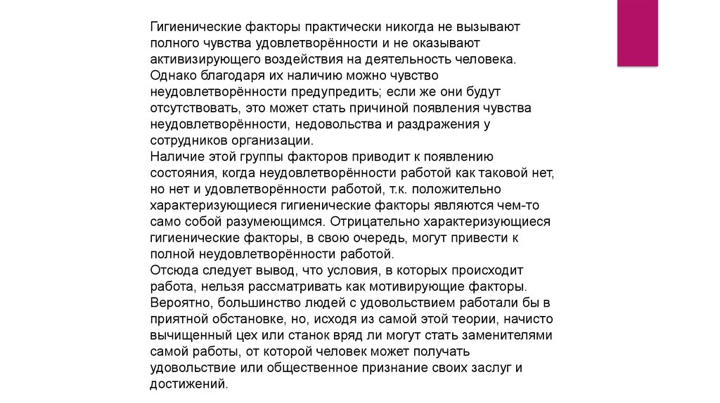 Гигиенические факторы практически никогда не вызываютполного чувства удовлетворённости и не оказывают