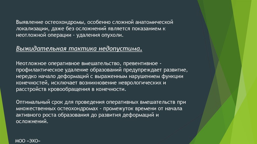 Выявление остеохондромы, особенно сложной анатомическойлокализации, даже без осложнений является показанием к
