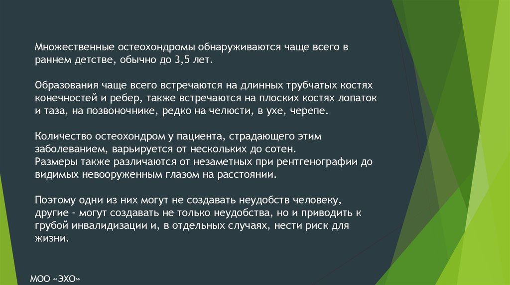 Множественные остеохондромы обнаруживаются чаще всего враннем детстве, обычно до 3,5 лет.