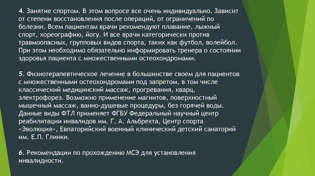 4. Занятие спортом. В этом вопросе все очень индивидуально. Зависитот степени восстановления после операций, от ограничений по