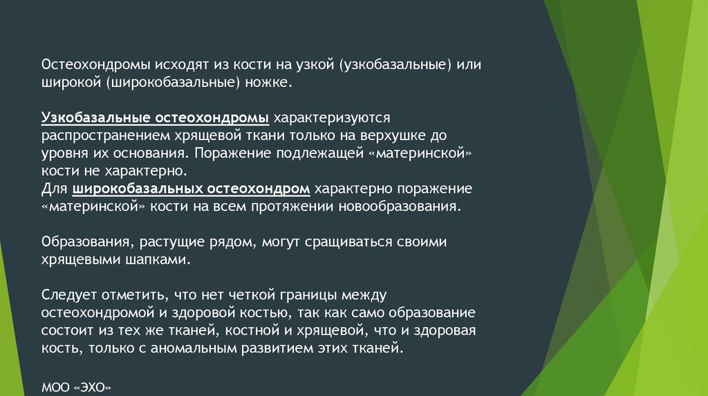 Остеохондромы исходят из кости на узкой (узкобазальные) илиширокой (широкобазальные) ножке.