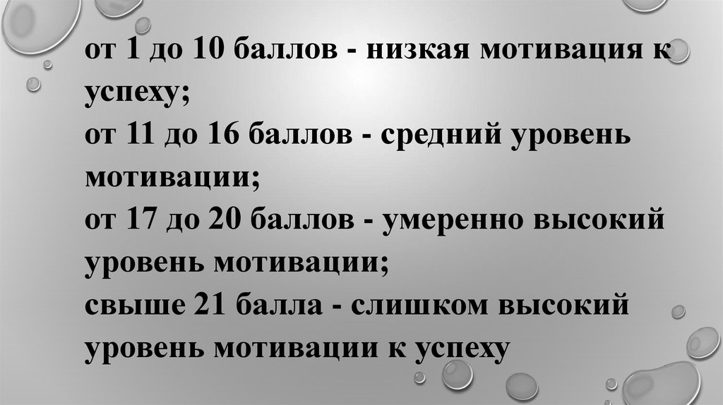 от 1 до 10 баллов - низкая мотивация куспеху;