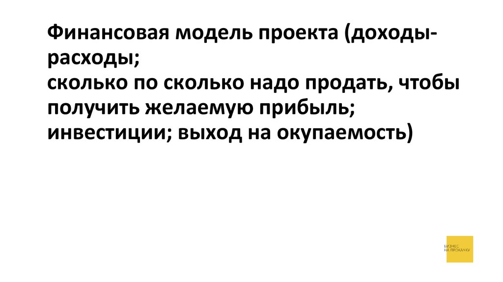 Финансовая модель проекта (доходырасходы;сколько по сколько надо продать, чтобы
