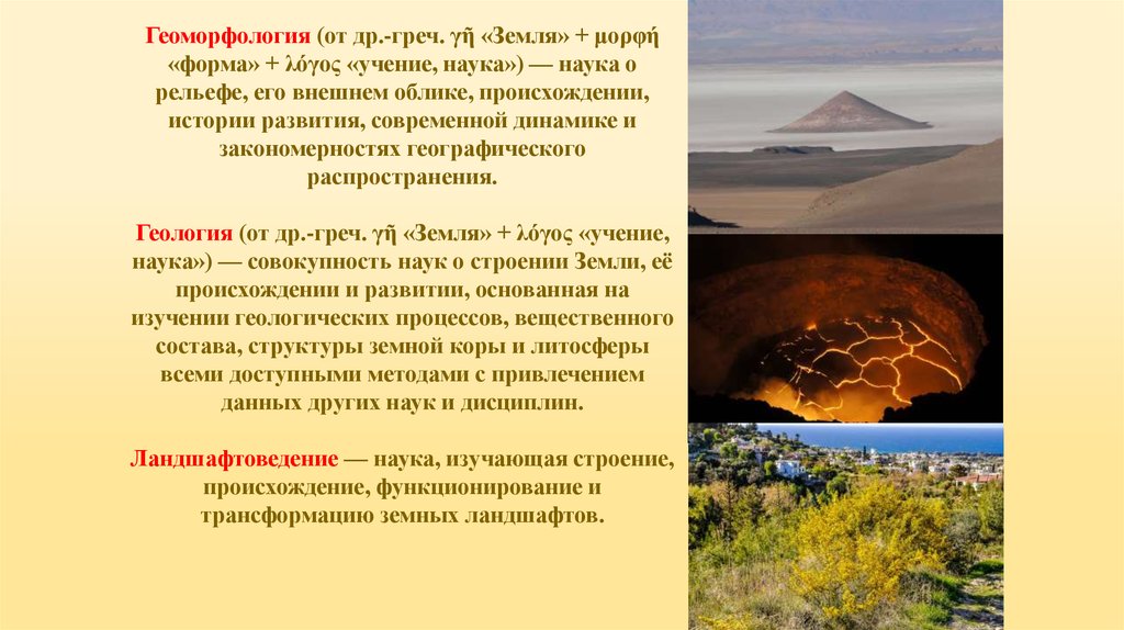 Геоморфология (от др.-греч. γῆ «Земля» + μορφή«форма» + λόγος «учение, наука») — наука о