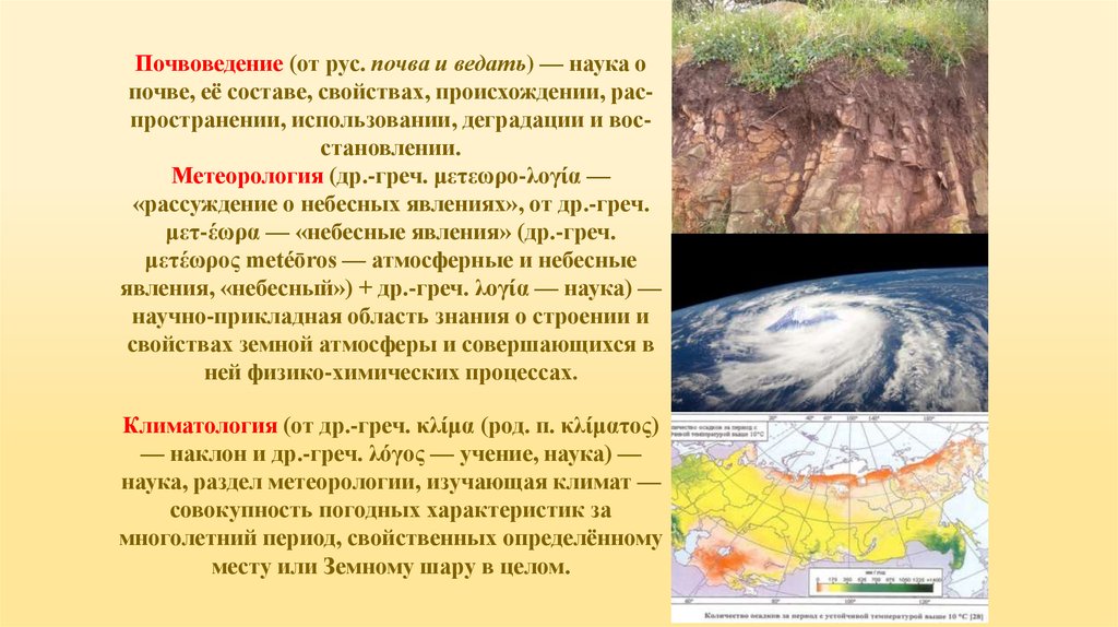 Почвоведение (от рус. почва и ведать) — наука опочве, её составе, свойствах, происхождении, распространении, использовании, деградации и восстановлении.