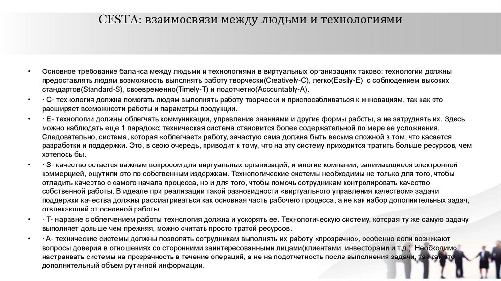 CESTA: взаимосвязи между людьми и технологиямиОсновное требование баланса между людьми и технологиями в виртуальных организациях таково: технологии должны